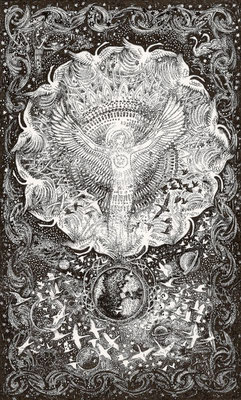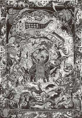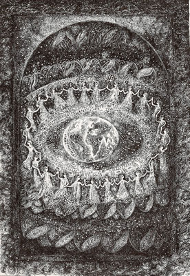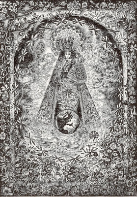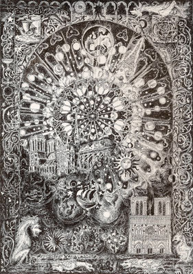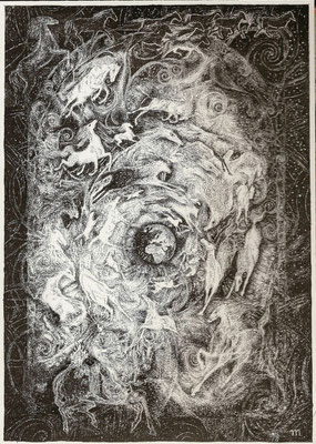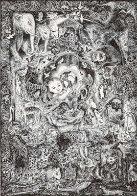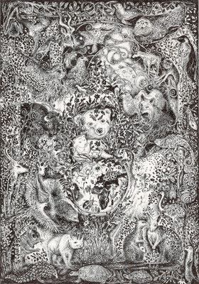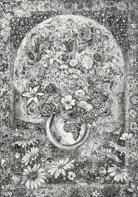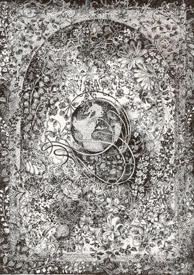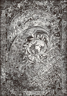 "La plupart de ces dessins m'accompagne, partout où je suis ,des petits formats que je sors de mon sac. J'en ai toujours un nouveau en route : chaque petit point, chaque petit trait permet l'accès à une séance d'hypnose ou de conscience différente très utile, on peut sortir du temps et entrer dans un autre . Une sorte d'art thérapie naturel ."